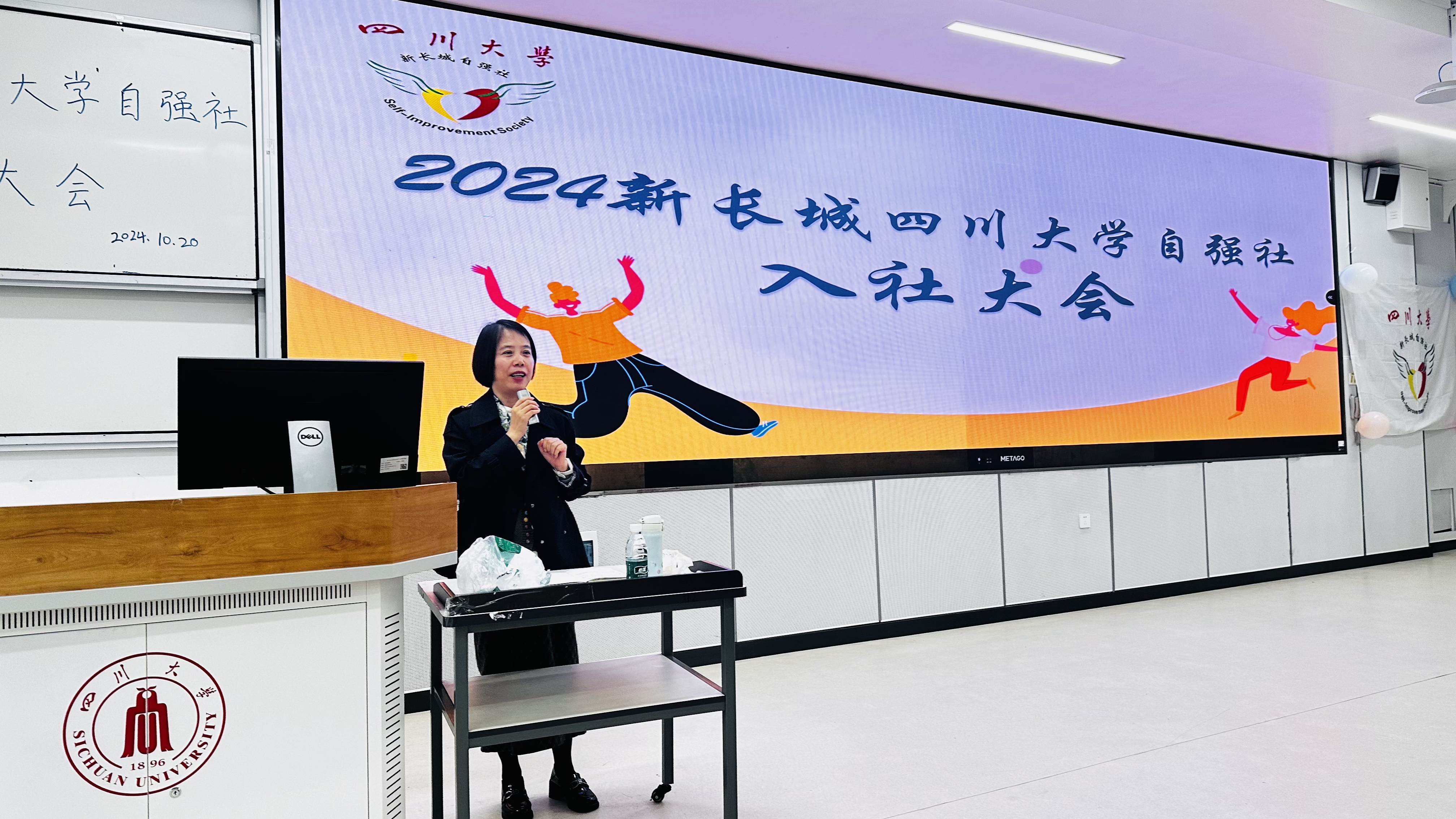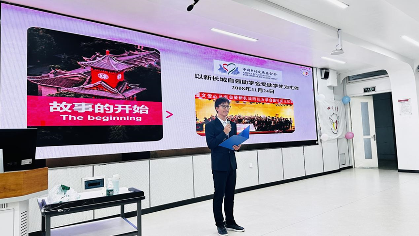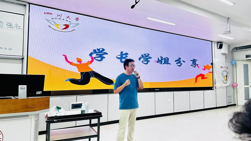 活动中,2008级学生、现在西南交通大学任教的罗佳从社团《章程》讲起,向新社员介绍了社团的历史和使命,憧憬了社团为社员创造一片心灵的净土、搭建一个精神家园、与社员一生相伴的理想。随后他从自己在川大和离开川大两种视角讲述了自己和社团的故事。最后他引用“大其心,容天下之物;虚其心,受天下之善;平其心,论天下之事;潜其心,观天下之理;定其心,应天下之变”,与大家共勉要做一个心胸豁达,谦卑坦荡,信念坚定,正直向上的人。