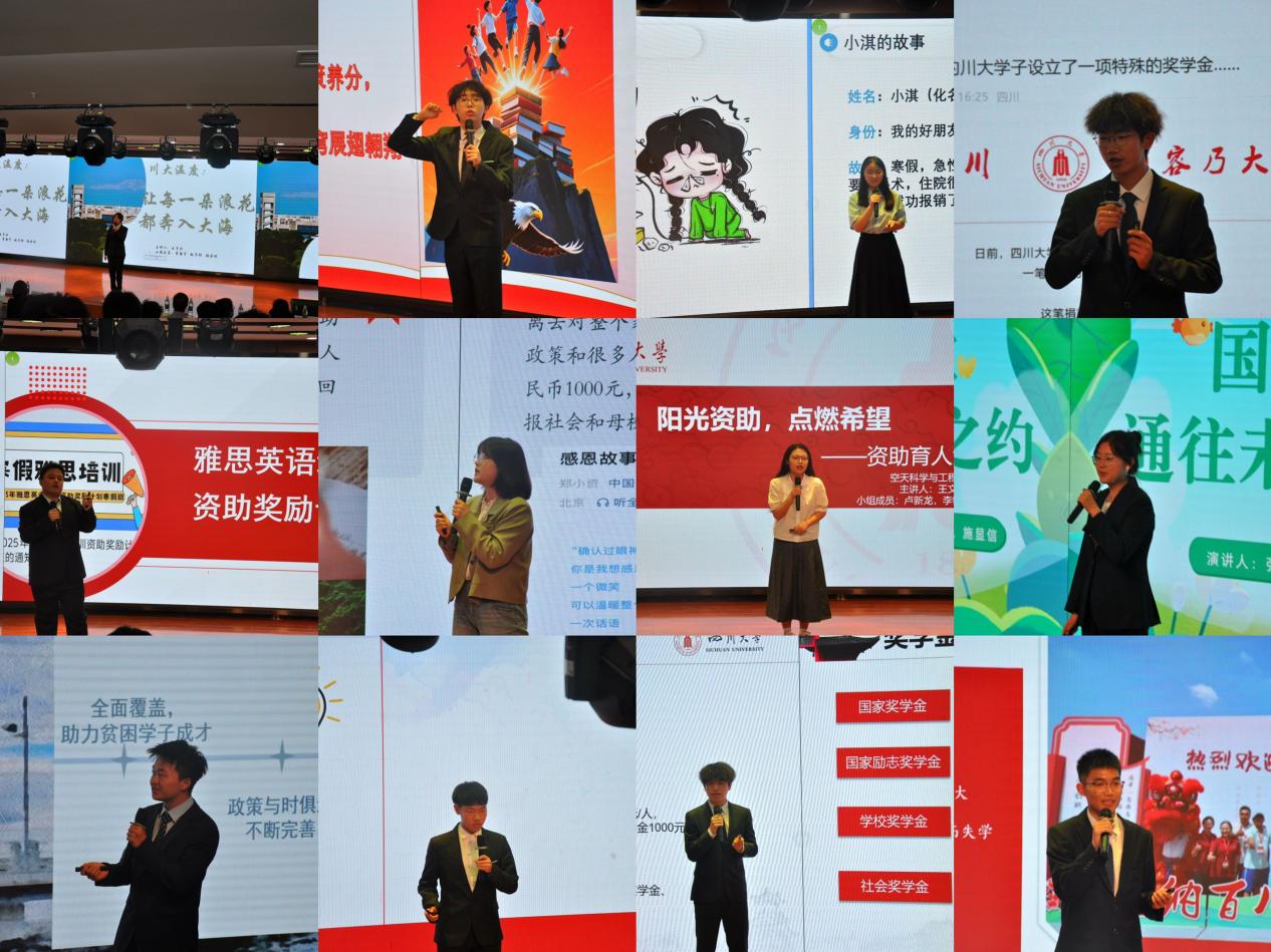 比赛不止于讲述,更见巧思突围——王宇兴以“三维守护”体系为帆,一句“川大温度,让每一朵浪花都奔入大海”掀起全场共情浪潮;徐顺抛出“14元命题”,从勤工助学岗位的第一笔收入切入,剖开“自立自强”的成长密码;张婉汝与徐扬奇化身“故事侦探”,用“助学贷款还款记”破解政策壁垒;文博则开启“干货直通车”,用清晰图表和案例清单,让学费补偿政策秒变“易懂百科”。
