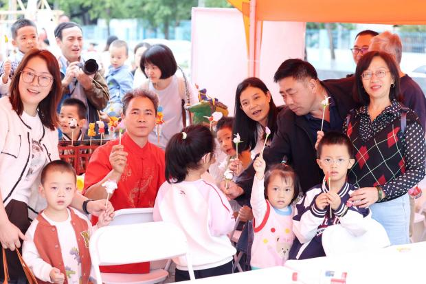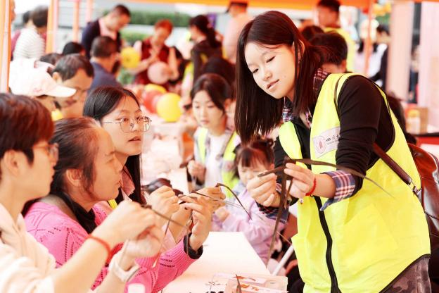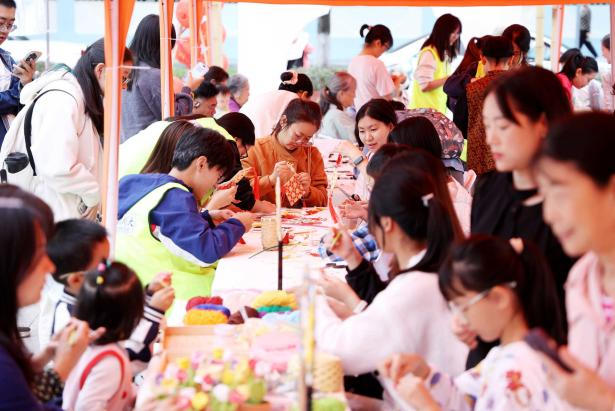 市集区域,蜀绣、面塑、竹编、皮影、蛋壳画、彩灯等众多非遗项目一字排开。传承人们现场示范教学,学生们则踊跃参与互动。在亲手体验中,青年学子们沉浸式地领略到传统工艺的智慧与精妙。参与师生纷纷表示,这样的活动让传统文化变得可亲可感。活动还吸引了众多川大教职工以及附幼、附小的小朋友积极参与。