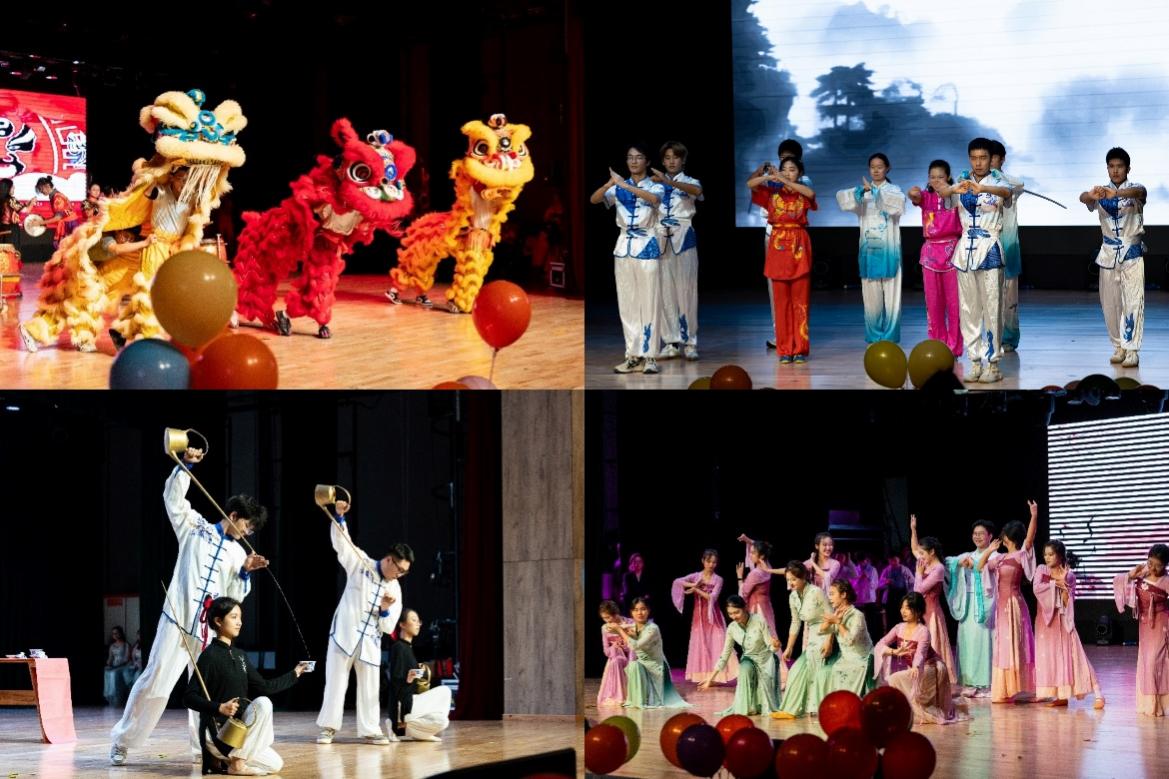 本次汇报展演以“非遗文化与美育融合”为主线,分篇章呈现了一场多元交融、精彩纷呈的艺术盛宴。开篇以《龙狮变,鼓乐天》点燃全场,舞狮的憨劲、川剧变脸的奇幻与狮鼓的激昂交织融合,将非遗技艺的魅力展现得淋漓尽致;随后,刚劲有力的武术表演展现中华武术魂,长嘴壶茶艺演绎东方生活美学,韵味悠长的古典舞尽显东方韵律之美。