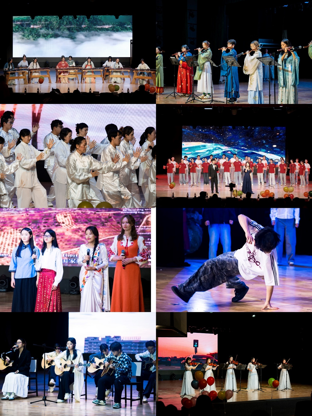 传统器乐与声乐篇章同样精彩迭出。古琴演奏空灵悠远,竹笛旋律悠扬婉转,24式太极拳表演沉稳舒展,每一个动作、每一段旋律都传递着中华传统文化的平和与力量;江安声乐班带来的合唱《明天会更好》,以清亮歌声寄托对未来的美好期许。此外,展演更融入多元现代元素:中外学员携手演绎的英语合唱《Heal the World》传递跨文化温情,街舞表演的动感节奏、吉他弹唱的青春旋律、小提琴演奏的动人乐章,尽显学员们宽广的艺术视野与多元创造力,完美诠释“传统为根、现代为翼”的美育理念。