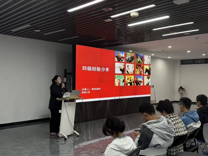 分享会上,李亦加伊同学首先对英语四级考试进行系统介绍。她结合自身参与四级考试经历,详细说明考试题型构成、分值分布及时间分配规则,强调听力、阅读、写作、翻译四大模块的核心考察重点,分享自身学习资料和应对方法,帮助同学们建立对四级考试的全面认知,明确备考方向。