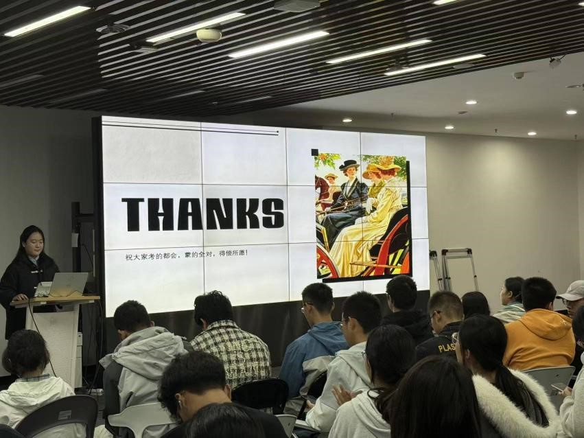 李亦加伊同学通过总结自己英语四级考试取得较高分数的经验,为新生同学分享了长期英语学习的经验和方法。在“长期攻略”中,她鼓励同学们通过观看英语电影、阅读名著书籍培养对英语学习的兴趣,使用单词类APP,养成积累词汇量的习惯。在“短期攻略”中,她针对四级考试每个模块给出了自己的做题策略。在听力模块,她拆解不同题型的出题规律,讲授“预读选项定位关键词”“捕捉逻辑信号词”等实用技巧;在阅读模块,她从选项关键词的定位策略、快速阅读的略读技巧,到选词填空的词性判断方法,结合真题实例进行细致讲解;在写作与翻译模块,李亦加伊同学在分享中强调了逻辑衔接与高级词汇的运用,还分享了汉英句式转换技巧及易错点规避方法。同时,她也推荐了实用备考资料与时间规划方案,为同学们提供可落地的备考参考。