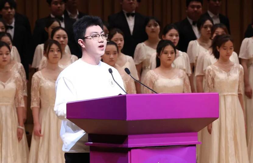 开幕式上,我校文学与新闻学院学生邹天乙作为参赛学生代表登台发言。他分享了合唱排练中锤炼专注品格、凝聚团队力量的成长感悟,表达了西部青年以歌声传递爱国情怀、文化自信与青春担当的真挚愿望,展现了川大学子的精神风貌。