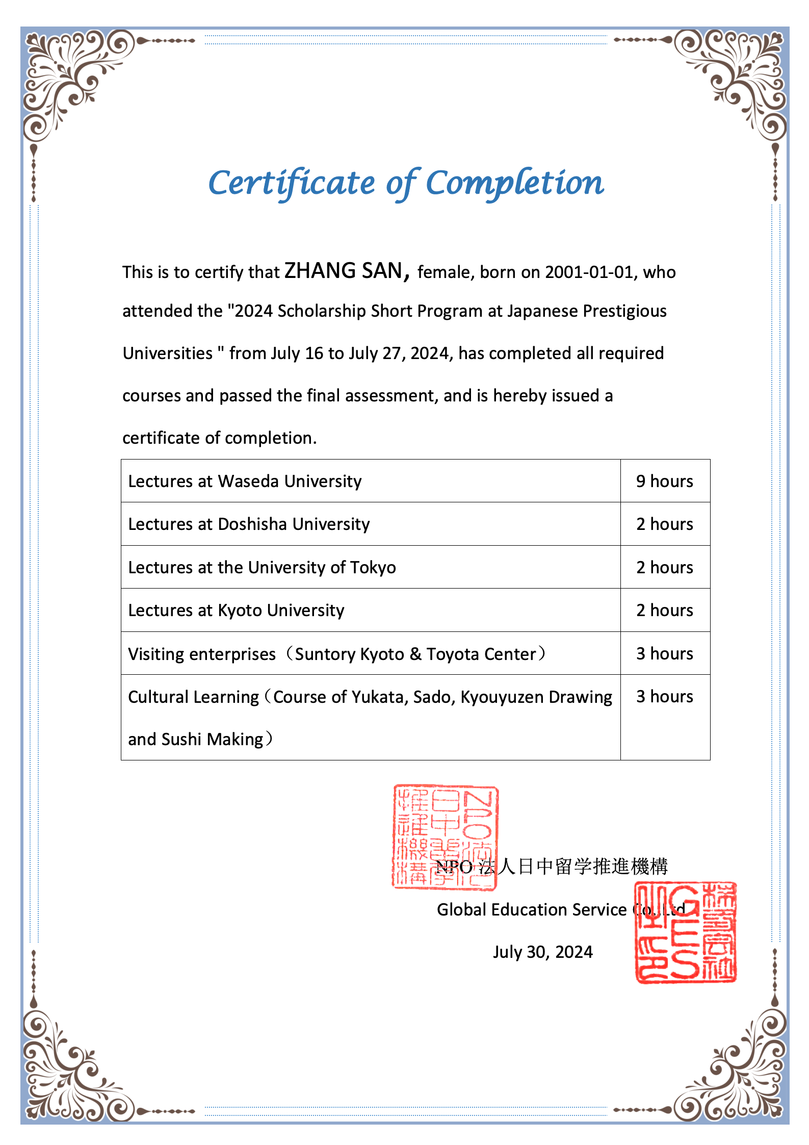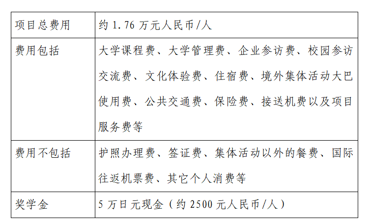 项目在日期间,NPO日中留学推进机构主办部门将为每位顺利完成项目的学员颁发结业证书及5万日元现金(约人民币2500元/人)的奖学金。
