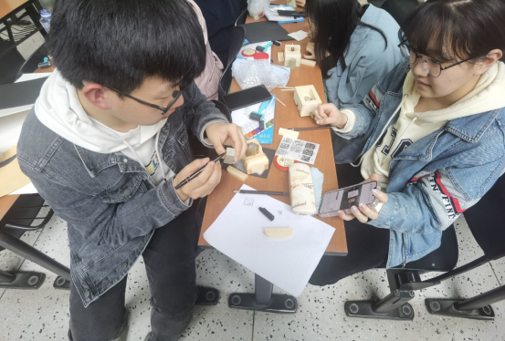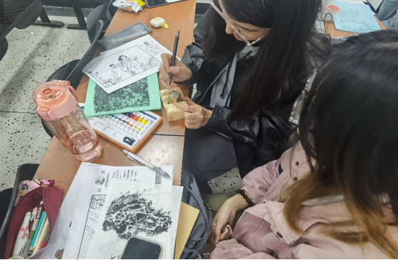 图 4 负责同学热心讲述刻板创作流程,让同学们在一笔一画间感受革命先辈们的崇高精神