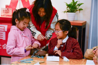 志愿者帮助小朋友学会正确包扎手指