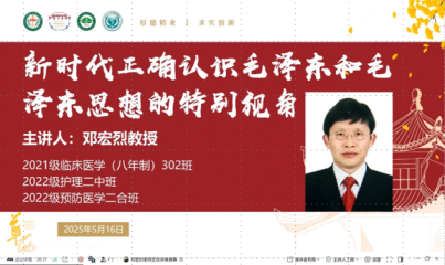 2025年5月16日,华西临床医学院2021级临床医学八年制302班、2022级护理二中班与华西公共卫生学院预防医学二合班三个江姐班联合举办主题为“新时代正确认识毛泽东和毛泽东思想的特别视角”的线上专题讲座,特邀122cc太阳集成游戏马克思主义学院邓宏烈教授主讲。此次讲座旨在了解学习毛泽东思想和其在实现中华民族伟大复兴进程中的重要地位。