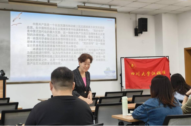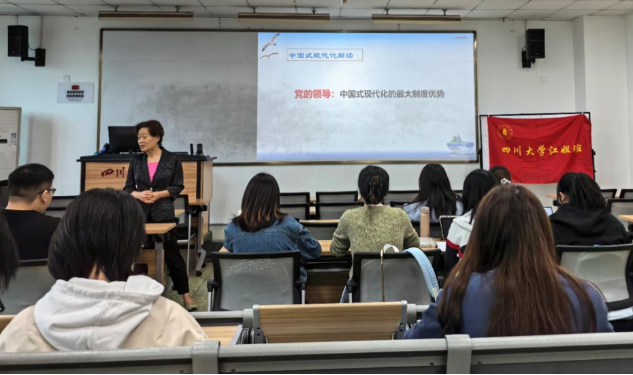为进一步推动习近平新时代中国特色社会主义思想入脑入心,增进青年学子对党的创新理论的政治认同、思想认同、理论认同、情感认同,10月24日,轻工科学与工程学院和商学院江姐班在望江校区商学院312教室,以“党的领导:中国式现代化的最大制度优势”为主题,开展理论学习活动。本次活动特邀马克思主义学院陈文泽教授主讲,带领同学们深刻理解党的全面领导的重要性。