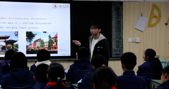 最后,黄观微同学为学生们分享了丰富多彩的大学生活。他以生动有趣的讲述活跃了课堂气氛,在展示大学生课余生活的同时,也激励同学们珍惜学习时光、不断努力奋斗,勇敢追逐自己的理想。他以亲身经历为学生们树立了积极向上的榜样形象,进一步引导他们明确目标、坚定信念,为未来的发展注入信心与动力。