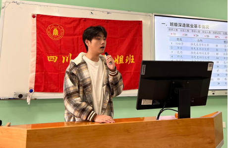 齐唱团歌后,江姐班团支书邱天汇报了江姐班深造就业基本情况、前三年学业成绩以及班团建设成果。褚老师充分肯定了班级的建设成果,并鼓励同学们再接再厉,争取获得更好的成绩。