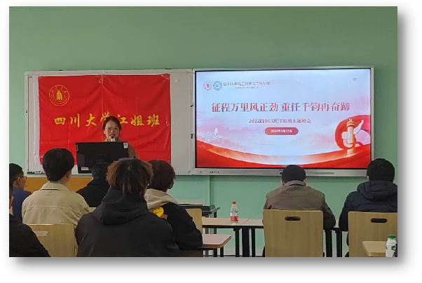 3月15日下午,轻工科学与工程学院江姐班2022级轻化工程103班)在江安校区综合楼B510开展了新学期主题班会活动暨导师见面会本次班会以“征程万里风正劲 重任千钧再奋蹄”为主题,学院党委副书记冯国涛副教授班主任周加境特聘研究员李国英教授、但年华副教授、谭淋副研究员、肖霄副研究员以及103班全体同学参加了本次班会。主题班会由学院学生事务办公室主任、2022级辅导员贺婷老师主持。