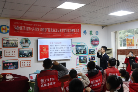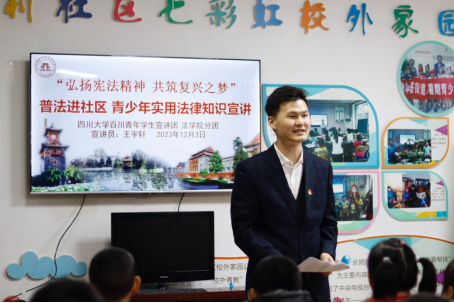 为深入推进学习宣传贯彻习近平法治思想、习近平文化思想,迎接第十个“国家宪法日”,大力弘扬宪法精神,建设社会主义法治文化,2023年12月3日,122cc太阳集成游戏百川青年学生宣讲团法学院分团走进成都市武侯区玉林街道南虹村社区新时代文明实践站,开展“弘扬宪法精神 共筑复兴之梦”国家宪法日主题宣讲暨“普法进社区”志愿服务实践活动。武侯区玉林街道南虹村社区党员、青少年共60余人参加了此次活动。