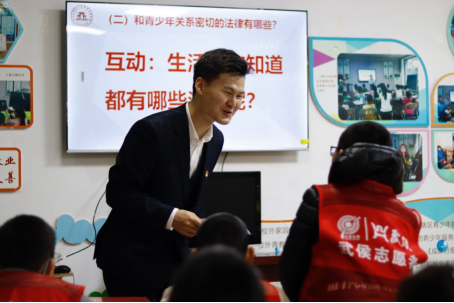 宣讲员王宇轩同学首先从习近平法治思想的提出背景、地位意义、体系构成入手,重点讲解了“法”的概念和“坚持建设中国特色社会主义法治体系”的内涵外延,并就“你知道生活中都有哪些法律”与现场青少年开展了互动交流。