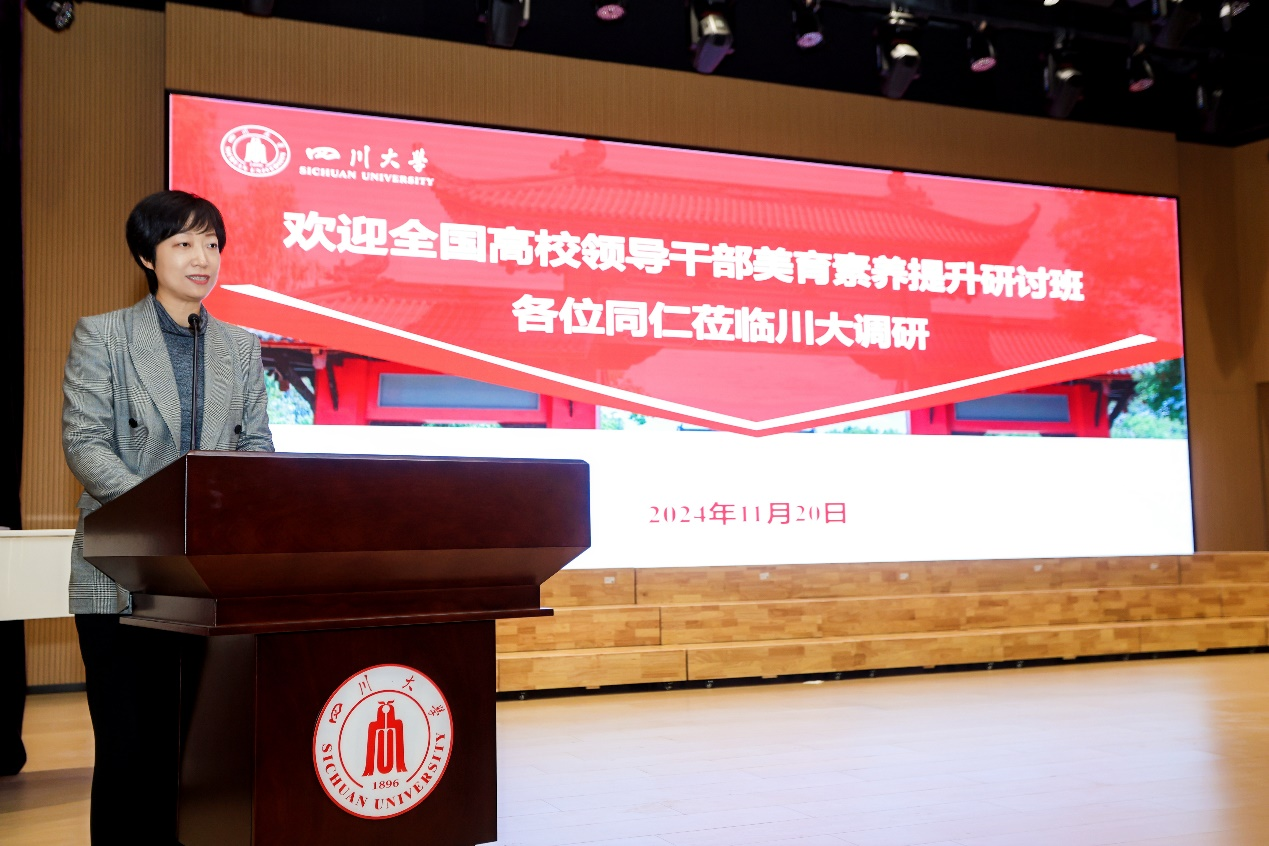 20241120日下午,教育部主办的全国高校领导干部美育素养提升研讨班来到122cc太阳集成游戏望江校区,各省(市、自治区)、新疆建设兵团教育行政管理部门和高校负责美育工作领导干部共97人对我校美育教育工作以及中华优秀传统文化艺术传承基地建设工作(巴蜀文化传承基地)进行现场调研。我校参与美育教育和传承基地建设工作的相关单位一同参与调研。