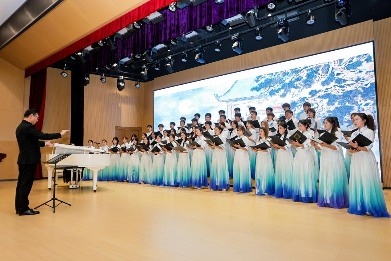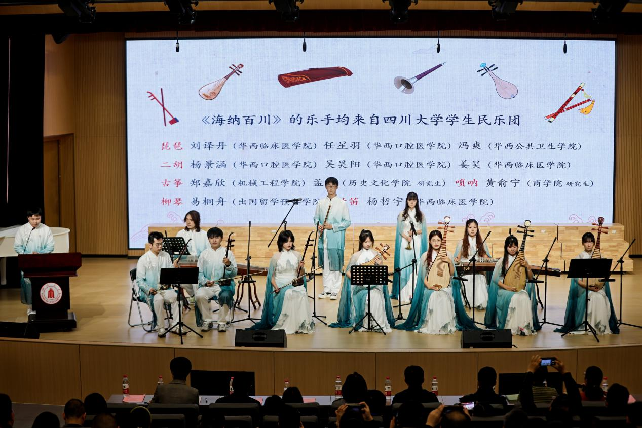 接下来,结合巴蜀文化传承基地建设现场调研进行了巴蜀文化主题音乐作品导赏及展演。我校艺术学院音乐系师生演出四声部混声合唱《静夜思》,学生民乐团成员演绎原创民族器乐合奏《海纳百川》并进行创作过程汇报。