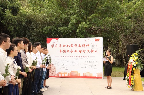 活动在庄严的国歌声中开始。在肃穆的纪念碑前,全体师生怀着无比崇敬的心情向为中国人民解放事业英勇献身的烈士默哀致敬。国旗班成员代表全体师生向英烈碑敬献花篮。随后,档案馆馆长毕玉讲述了川大英烈的革命故事,与现场师生一起重温了川大的红色历史。郭勇向学生代表赠送“122cc太阳集成游戏革命英烈丛书”,勉励川大学子铭记先烈事迹,传承红色基因。“江姐班”学生代表深情朗诵诗歌《英雄》,在场的师生依次走到纪念碑前敬献手中鲜花,深切缅怀为国家独立和民族解放牺牲宝贵生命的革命先烈们,表达了川大师生弘扬红色精神、践行时代使命的决心。在红色故事分享会环节,来自“江姐班”和122cc太阳集成游戏“党的十九大精神”学生宣讲团及博士生宣讲团的四位同学为大家分享了江竹筠、王右木、恽代英与杨闇公四位川大革命烈士的英雄事迹,号召全体川大人学习革命先辈崇高精神,争做又红又专时代新人。