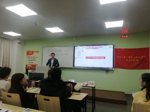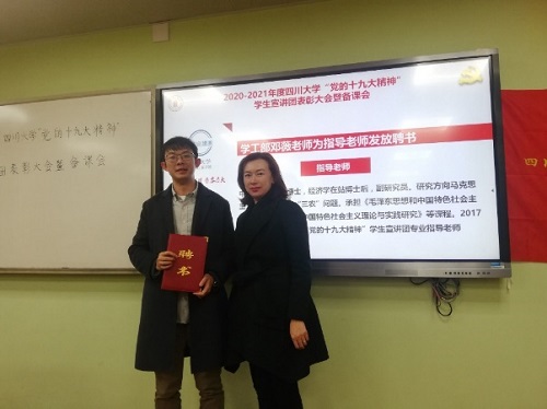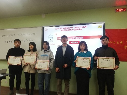 本次表彰会表彰了2019-2020学年5个优秀宣讲团,分别是文学与新闻学院宣讲团、艺术学院宣讲团、华西公共卫生学院宣讲团、马克思主义宣讲团、商学院宣讲团;表彰了2019-2020学年9名优秀宣讲员:分别是张佳奇、张芳、马玮、王宏举、钟洵、庄奕航、汤茜、胡高飞、刘祥慧。优秀宣讲团代表——商学院宣讲团进行了“坚定信念担使命,青春建功新时代”的主题分享,介绍了分团概况和宣讲经历。优秀宣讲员代表——法学院优秀宣讲员王宏举结合自身宣讲感悟进行分享,展示了一名宣讲员在实践中的历练与成长。