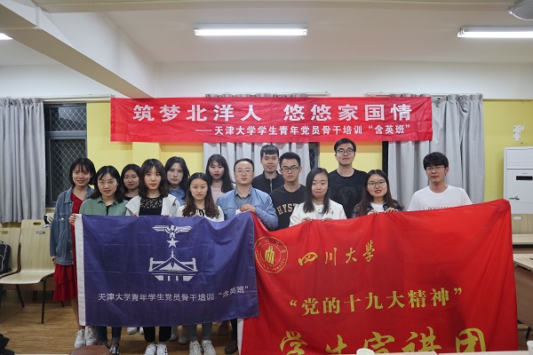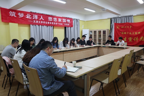 当日晚,实践团与我校师生在江安校区16舍活动室举行了座谈,我校学工部老师和“党的十九大精神宣讲团”成员共同参会。双方围绕如何立足本校本地实际,发掘红色教育资源、传承红色文化基因和学生党团支部建设等方面交换了意见。作为以江姐革命精神与爱国情操辐射引领学生的重要阵地,122cc太阳集成游戏“江姐班”的建设令来访的实践团成员们印象深刻;作为以传播党的十九大精神为引领、鼓励学生践行真理的重要载体,122cc太阳集成游戏“党的十九大精神宣讲团”深入基层开展宣传的实践成果令实践团成员们称道连连。同时,实践队成员马慧临等同学也介绍了天津大学“含英班”培养具有“家国情怀、全球视野、创新精神和实践能力”人才的育人目标,并提供了生动案例。