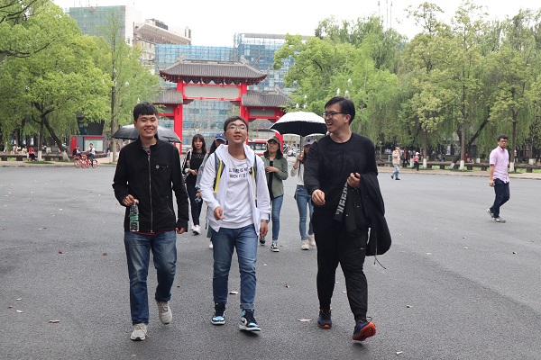 走出纪念馆,漫步在青葱校园,实践团成员与我校学子畅怀交流。我校思想理论青年研习社副社长张宇豪同学向实践团介绍了研习社在助推校园文化建设和实践教育活动方面的特色工作,氛围友好而热烈。