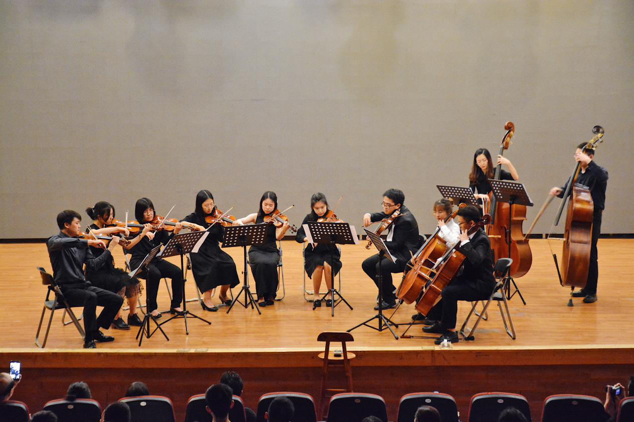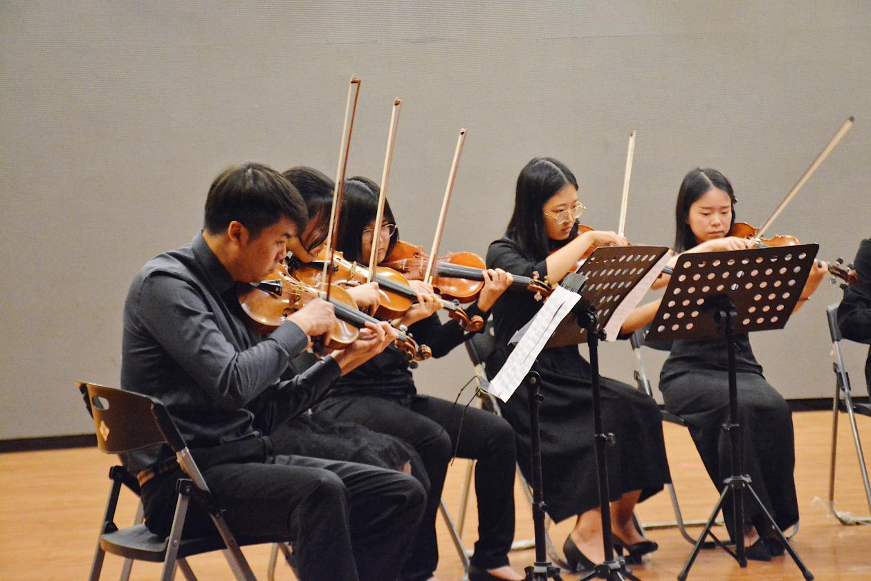 来自四川音乐学院的两位老师合作演奏了苏联作曲家肖斯塔科维奇创作的小提琴二重奏,由十一人弦乐队演奏了作曲家德沃夏克的《E大调弦乐小夜曲(第二乐章)》,还呈现了交响乐团同学整合编曲的经典音乐剧、影视作品配乐《The Fantasy》。外聘指导教师、四川音乐学院小提琴青年演奏家赵嵩老师对同学们的演奏给予了充分的肯定:“来自全校各个学院的同学们一直坚持每周抽出课余时间集中进行排练,特别不容易。我很欣慰看到他们不断的进步。”他还透露,交响乐团每学期都会定期举办室内乐教学分享会,以演出方式磨炼新团员,让他们在演奏技巧、音乐表现力、团队协作力上迅速成长。
