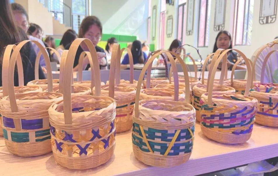 随后,杨老师现场教学编织彩条花篮,“挑二压二”的编法展现了传统技艺的魅力。同学们细心观察细节,零基础亲手体验,彩色竹丝一经一纬、一挑一穿,编出个性化创意。