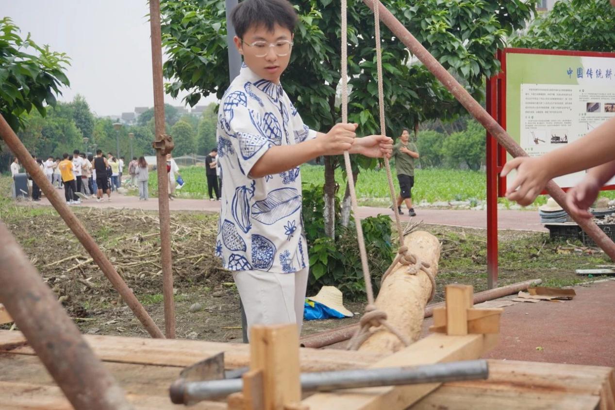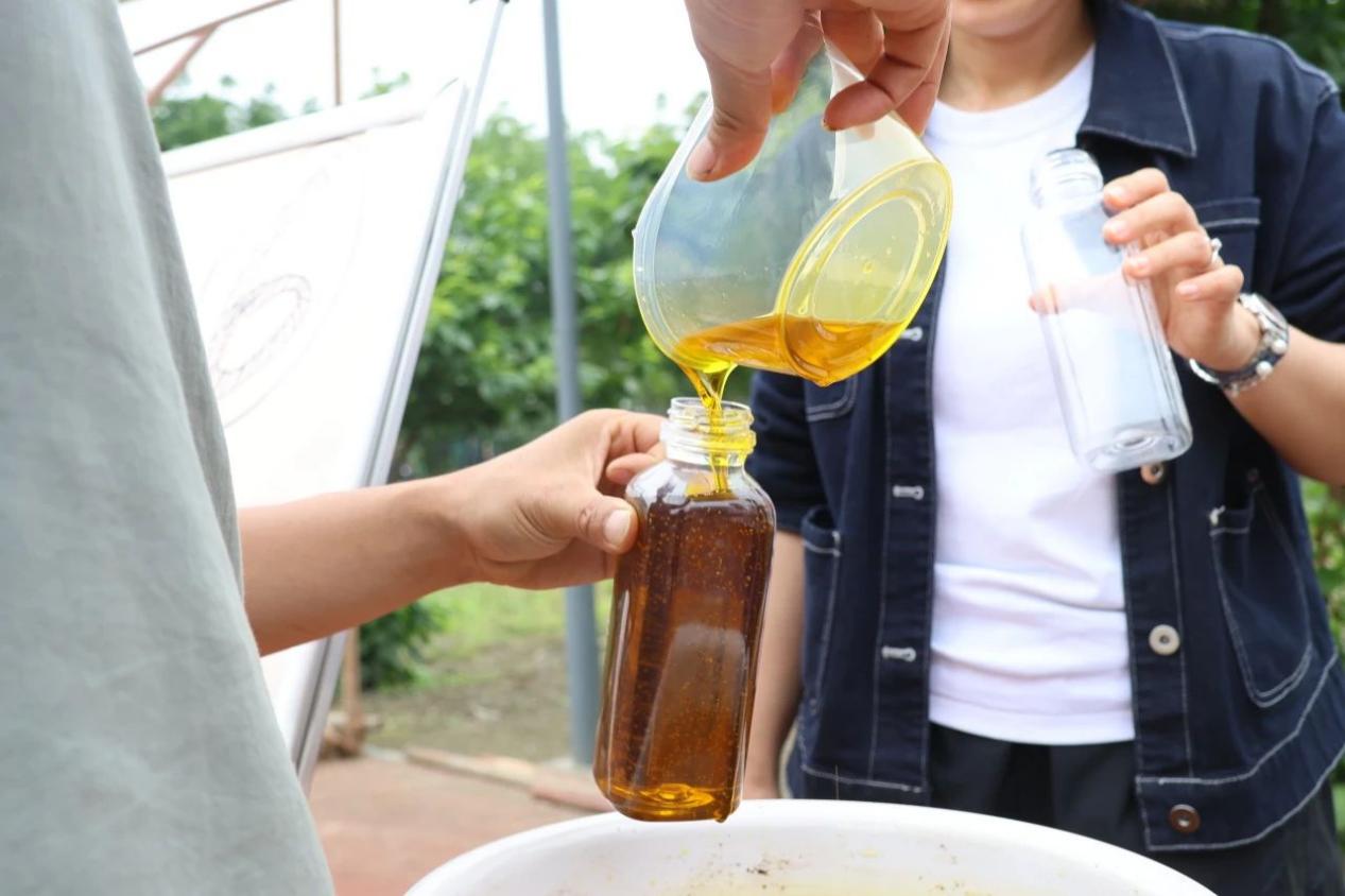 为了满足同学们对“油菜籽如何变成菜油”的期待,“开心农场”还引入传统农具,搭设“古法榨油”作坊,还原全链条的工艺流程,让同学们“沉浸式”观摩和实践制作过程。