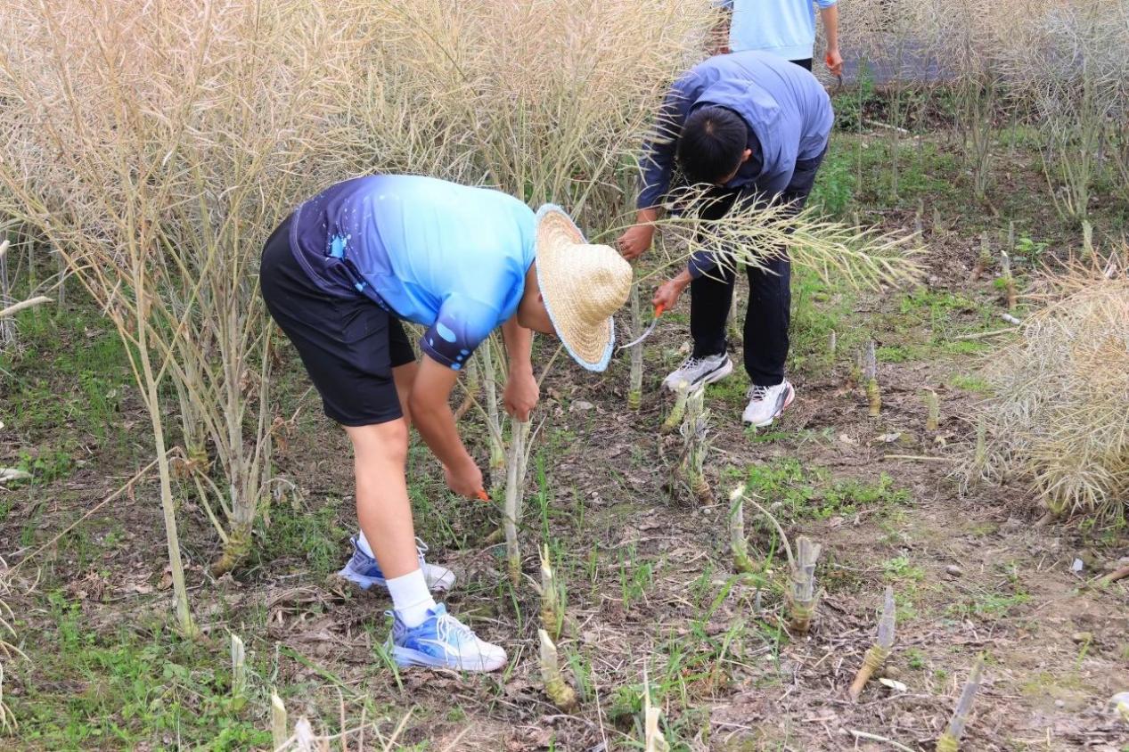 “俯下身,左手把住油菜茎底端,右手握住镰刀用力向上一拉,茎秆轻松就被割断了。”实践指导老师耐心为同学们示范操作。