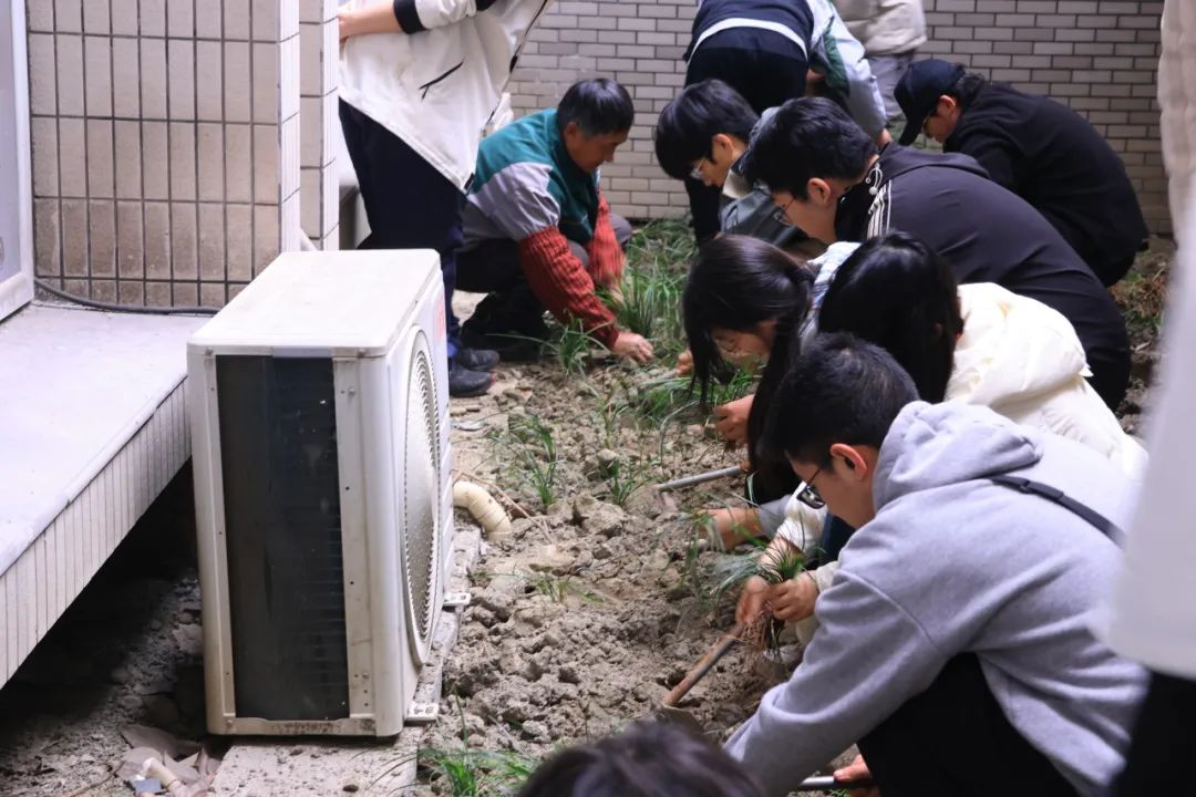 一砖一瓦皆为匠心,一草一木皆风景。园艺工人耐心示范着松土、分株、定植等栽种技巧,细致讲解沿阶草的养护要点。同学们小心翼翼剥离母株的须根,覆土、压紧,确保根部与土壤紧密结合,亲手为校园增添一片新绿。清理杂草、移栽苗木、清扫落叶,同学们躬下身、拿起工具,在春日暖阳下沉浸式劳动,让劳动成果成为校园里流动的风景。