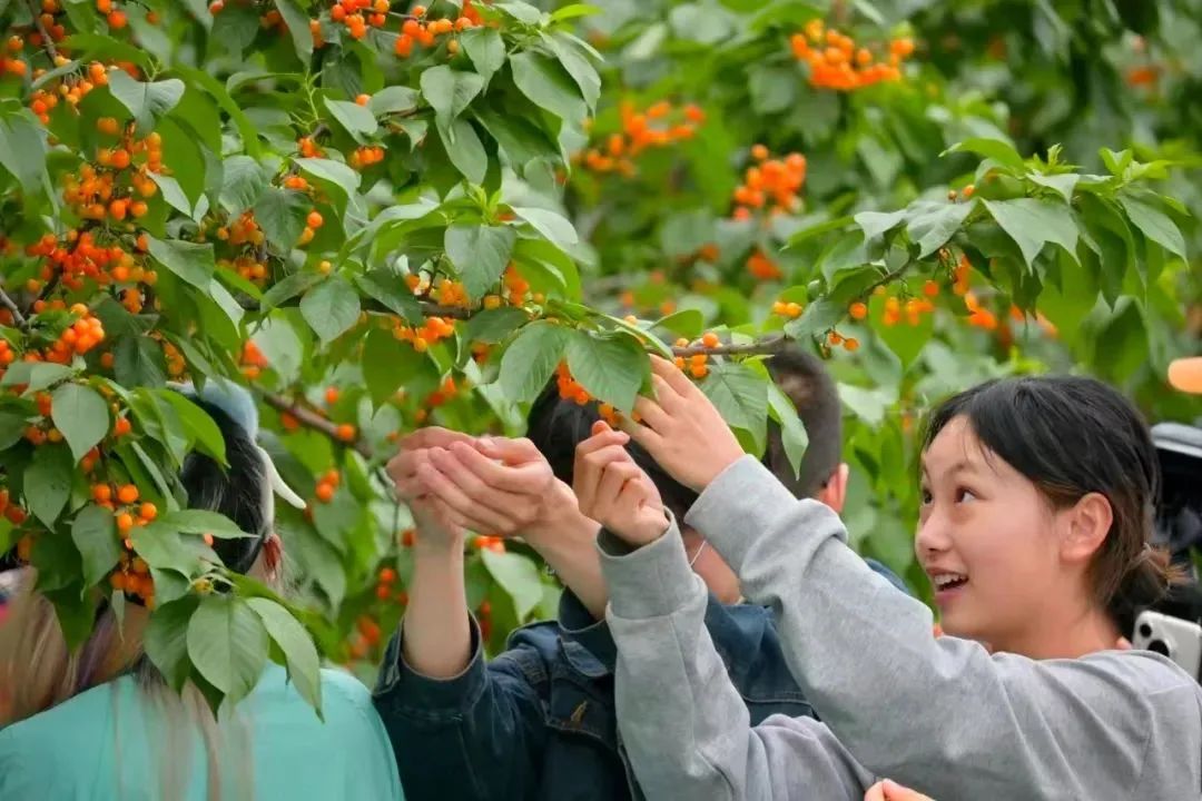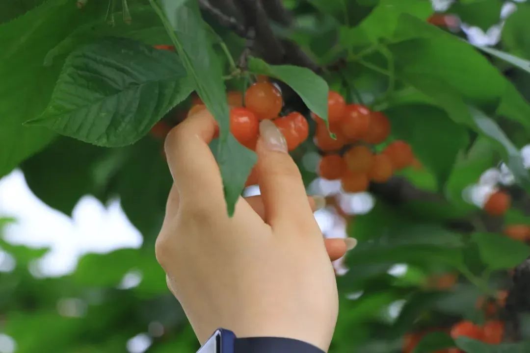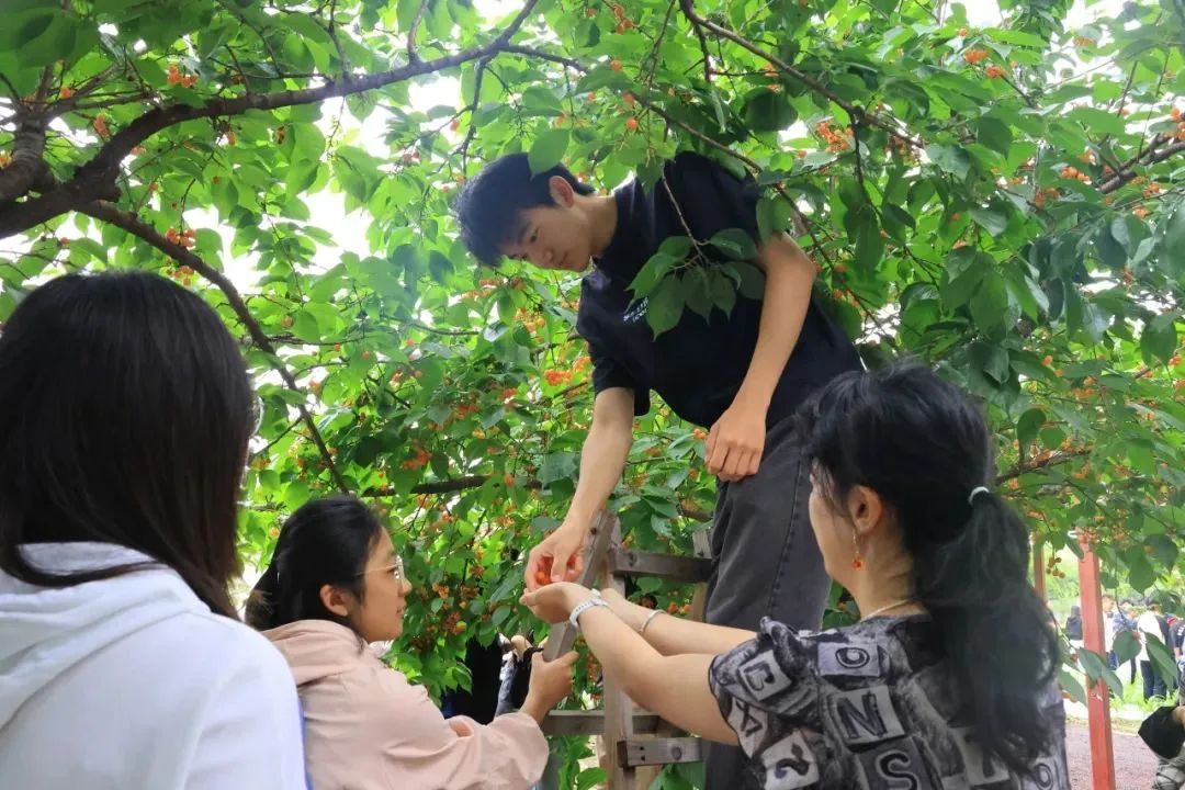 渐渐的,同学们掌握了采摘技巧,踩着梯子爬上高处,盯着枝头颜色红润、个头饱满的果子,边摘边尝,不一会儿小口袋盛满了大大小小的果实,分分钟实现“樱桃自由”。