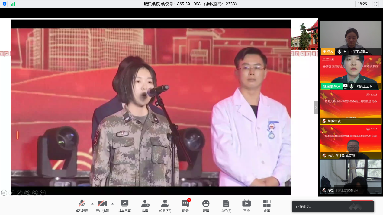 为积极推进我校征兵工作深入开展,4月30日,学校征兵工作站举行了2020年征兵工作线上培训及咨询会,学校征兵工作站工作人员、各学院征兵专员、退伍大学生士兵以及有志于参军入伍的学生一百余人参加了会议。