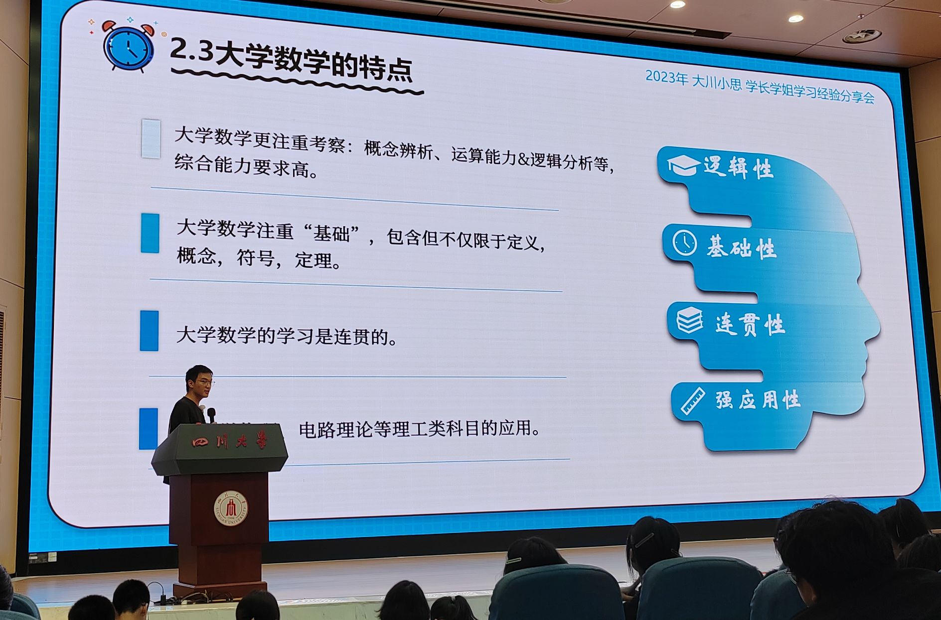 2023年9月24日晚,“万千精彩,为你而来”——大川小思学长学姐学习经验分享会在122cc太阳集成游戏江安校区一教A水上报告厅和B站“大川小思”线上直播间同步举行。张笑娟、孟远凌、毛雨佳、李宇灏、吕一飞和李鸣翔六位学生导师担任主讲人,面向2023级新生进行了有关学习效能、英语学习、数学学习、科研竞赛、升学规划五个主题的经验分享。