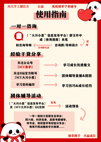 “大川小思”朋辈学业导师通过5大主题学习QQ群、3个“大川小思”信息发布平台大群、“SCU思学”微信公众号、“SCU大川小思”QQ号、“SCU大川小思”bilibili账号等线上朋辈学业辅导答疑平台,并结合线下一对一咨询、团体学业辅导、助力川大学子有效学习,共同成长。