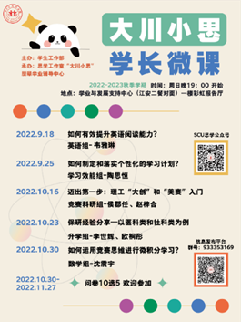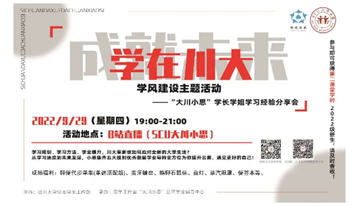 此外!最最最重要的是,小思会在每学年开学定期举行年度最大型活动——“学在川大 成就未来”学长学姐学习经验大分享,届时,小思优秀而亲切的学长学姐将就新生最关心和大学最重要的学习生活主题为新生进行答疑解惑!小思今年的经验分享会已在加紧筹办中,大家到时候记得关注小思的消息,9月24日晚7点来江安水报现场查收你们的专属福利噢!