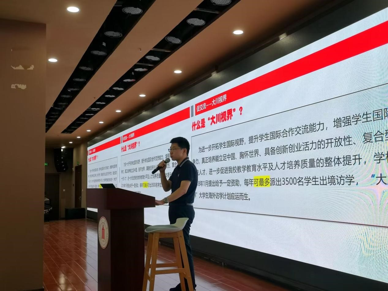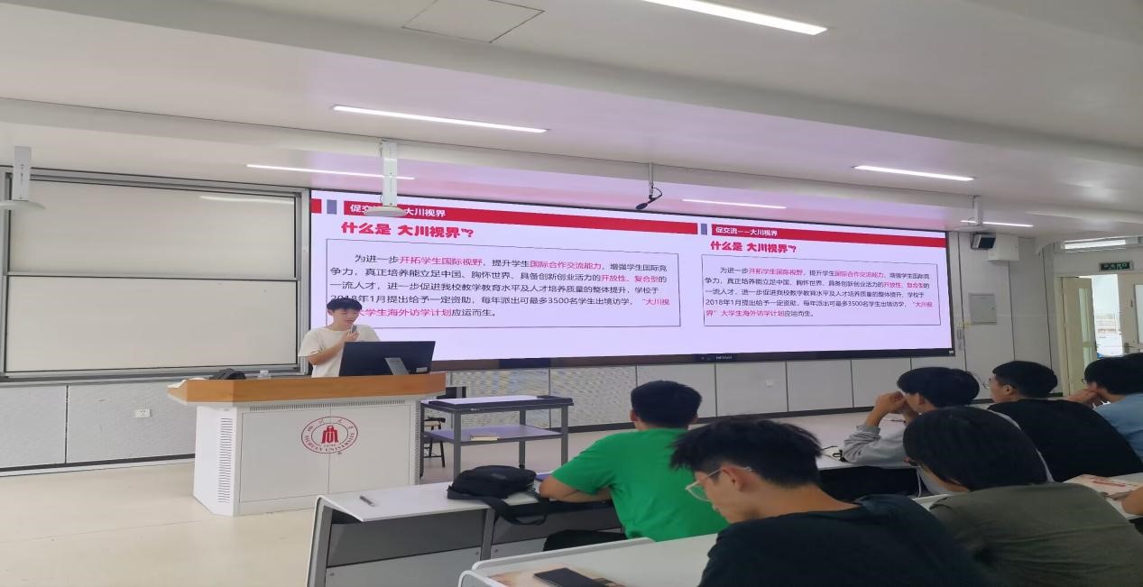 本轮宣讲聚焦学生出国(境)留学的意识激发,鼓励学生树立“志存高远,追求卓越”的远大志向,宣讲成员首先介绍了当前深造升学背景和形式,建议同学们要提前明确大学学业发展规划,对“大川视界”海外访学计划等多种访学形式进行介绍,并结合学工部为广大学生提供的学业帮扶和学业指导举措进行交流分享。