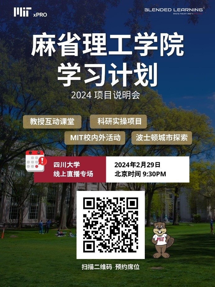 为拓展学生国际视野、提高国际胜任力,学校于近期启动了“MIT混合式学习项目”(2024年度“大川视界”暑期非学分项目)报名及选派工作,现就有关事项通知如下: