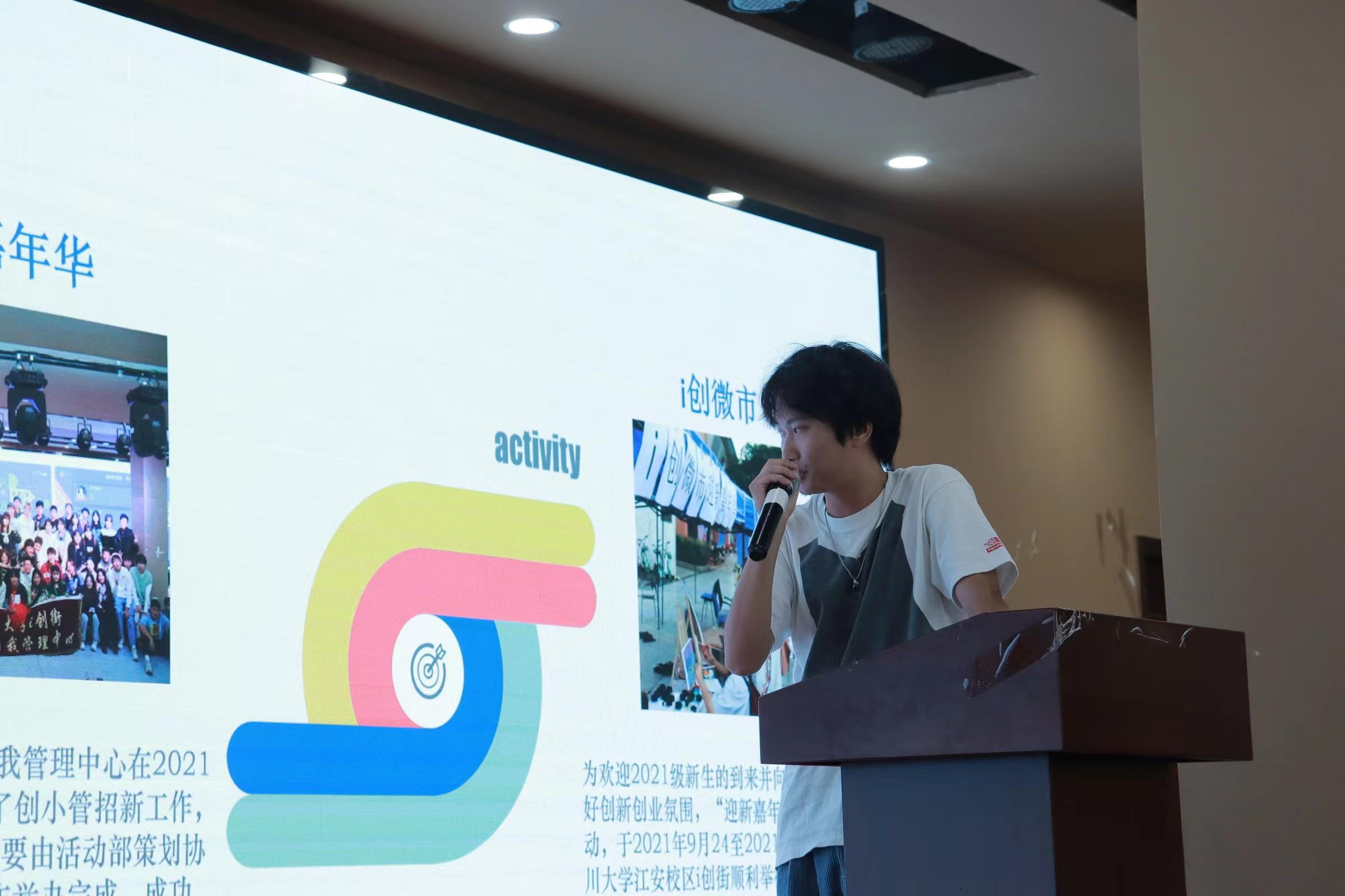 随后是创小管主席与各部门部长带来的学年工作总结。这一年中,办公室策划举办了三次创小管全体大会暨团建,并负责完成财务信息、物资场地的整理与管理及对外接待工作;活动部策划举办了迎新嘉年华、i创微市、拾物·冬日市集、锦绘中国等大型校级双创活动;创拓部协助完成了i创街店铺入驻答辩与中期答辩,同时完成了对i创街店铺与工坊的定期检查、钥匙换新、投诉处理等工作;编辑部完成了各类双创活动的新闻稿撰写、入驻团队采访、创小管工作月报与《吾双2022》杂志排版工作;宣传部准备了所有双创活动与团建的宣传物料,并负责了公众号运营、墙面设计等工作;外联部持续进行对外联络工作、并举办了两场“小管有话说”-创新创业指导讲座。