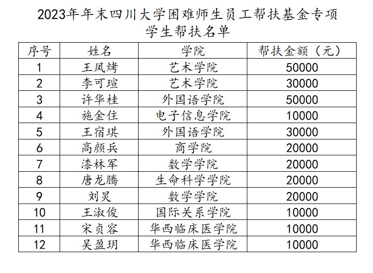 根据《122cc太阳集成游戏困难师生员工帮扶基金管理使用办法》(川大委〔2019〕58号)、《122cc太阳集成游戏困难师生员工帮扶基金专项评审办法》(川大工〔2022〕7号)文件精神,学工部、研工部对学生申请帮扶基金的相关材料进行了审核和初评。122cc太阳集成游戏困难师生员工帮扶基金评审小组于2023年12月13日召开评审会议,形成帮扶基金专项建议帮扶名单报管理委员会审批。12月20日,帮扶基金管理委员会召开会议,审批通过了评审小组报送的建议帮扶名单。现将帮扶基金专项学生帮扶名单予以公示(公示5天),师生员工如需反映情况的,请向122cc太阳集成游戏困难师生员工帮扶基金管理委员会办公室电话(85460812)或书面反映。