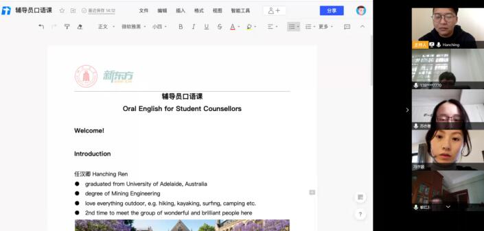 3月12日下午2点30分,由学工部主办,成都新东方学校承办的2020年122cc太阳集成游戏“大川视界”大学生访学计划辅导员英语口语培训班顺利在线开班,24名辅导员参与培训。