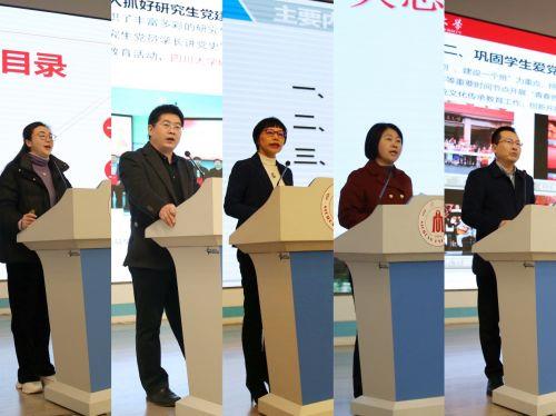 会上,计算机(软件)学院党委副书记朱敏、建筑与环境学院辅导员王天泽、华西口腔医学院党委副书记孙建勋、空天科学与工程学院党委副书记季袁东分别围绕“协同创新的研究生思政工作思考与探索”“聚焦思想引领 凝聚青春力量”“建设三全育人一流教育集合 培育卓越口腔医学人才”“树院风 振学风 以理想信念教育引领学风建设”等主题进行了工作交流发言;校团委书记赵露、研工部部长陈华明、就业指导中心副主任刘若冰、心理健康教育中心主任王英梅、学工部部长陈森对过去一年工作进行了总结,并对2022年承办好第十七届“挑战杯”国赛决赛、继续深入抓好研究生党建和思想政治教育、进一步促进毕业生就业工作、进一步改进学生心理健康教育工作措施、加强信息化建设增强学生工作精准度等学生工作重点进行了部署。