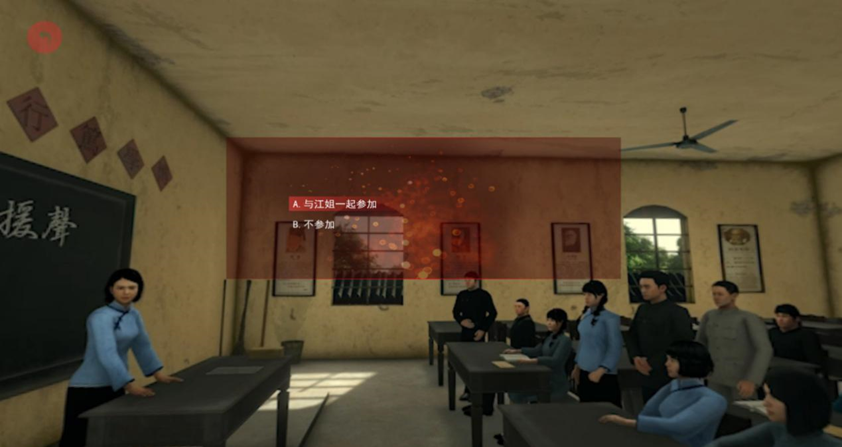 学生将以“江竹筠的同学”身份开始角色扮演游戏,在虚拟场景中与历史人物对话,共同经历体验历史事件,陪伴和参与江竹筠的成长历程和革命斗争。在每个关键事件结点中,完成相应的学习任务,例如“结识江姐”、“共同观影”、“支援昆明一二一惨案”等。每个场景均设置若干任务和测验,学生逐一完成后,即可获得相应的成绩。希望本项目能够让学生们感受到一个血肉丰满、可感可亲的“江姐”形象,也让江姐的革命精神在互动体验中深入学生们的内心。