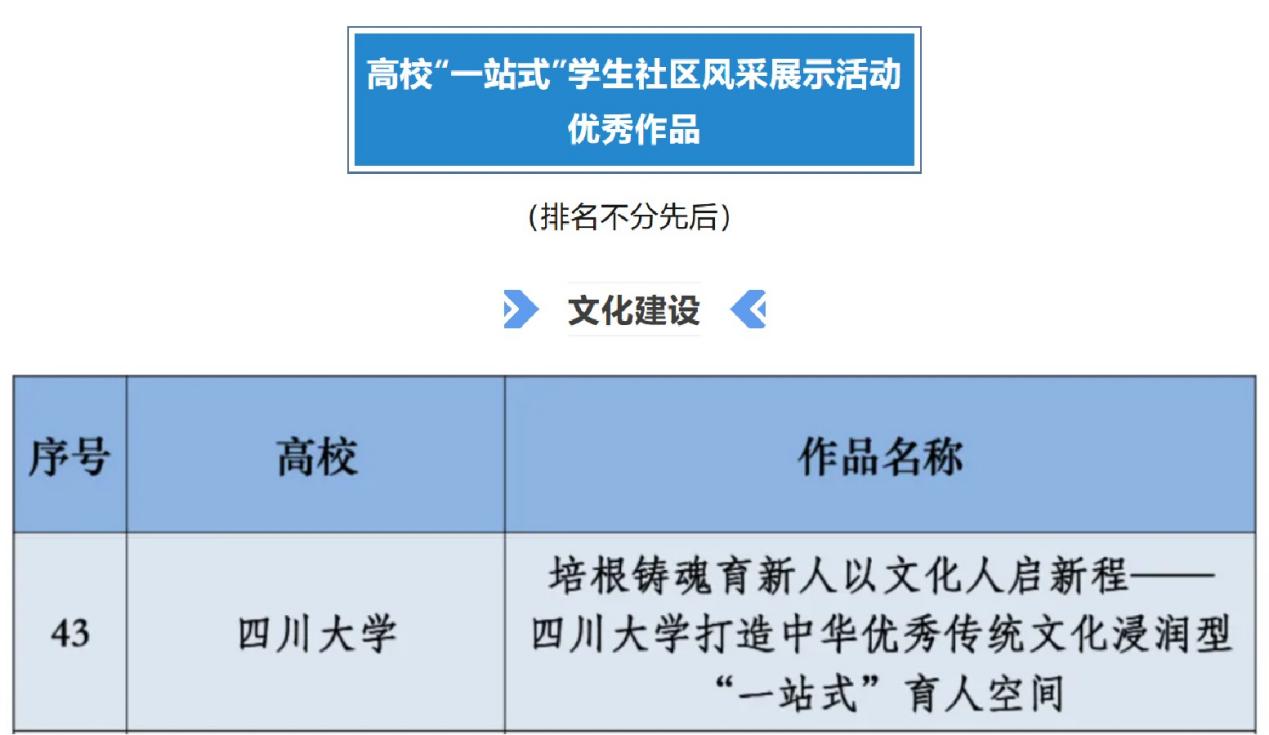 近日,教育部思想政治工作司公布2025年度全国高校“一站式”学生社区风采展示活动优秀成果名单。经高校推荐、专家评审等环节,122cc太阳集成游戏推荐报送的4项成果分别入选“队伍入驻”“文化建设”“数字赋能”“条件保障”版块优秀成果。122cc太阳集成游戏已连续三年共10项作品入榜高校“一站式”学生社区风采展示优秀成果,不断刷新“川大”范式学生社区“成绩单”。现将本年度入选作品展示如下。